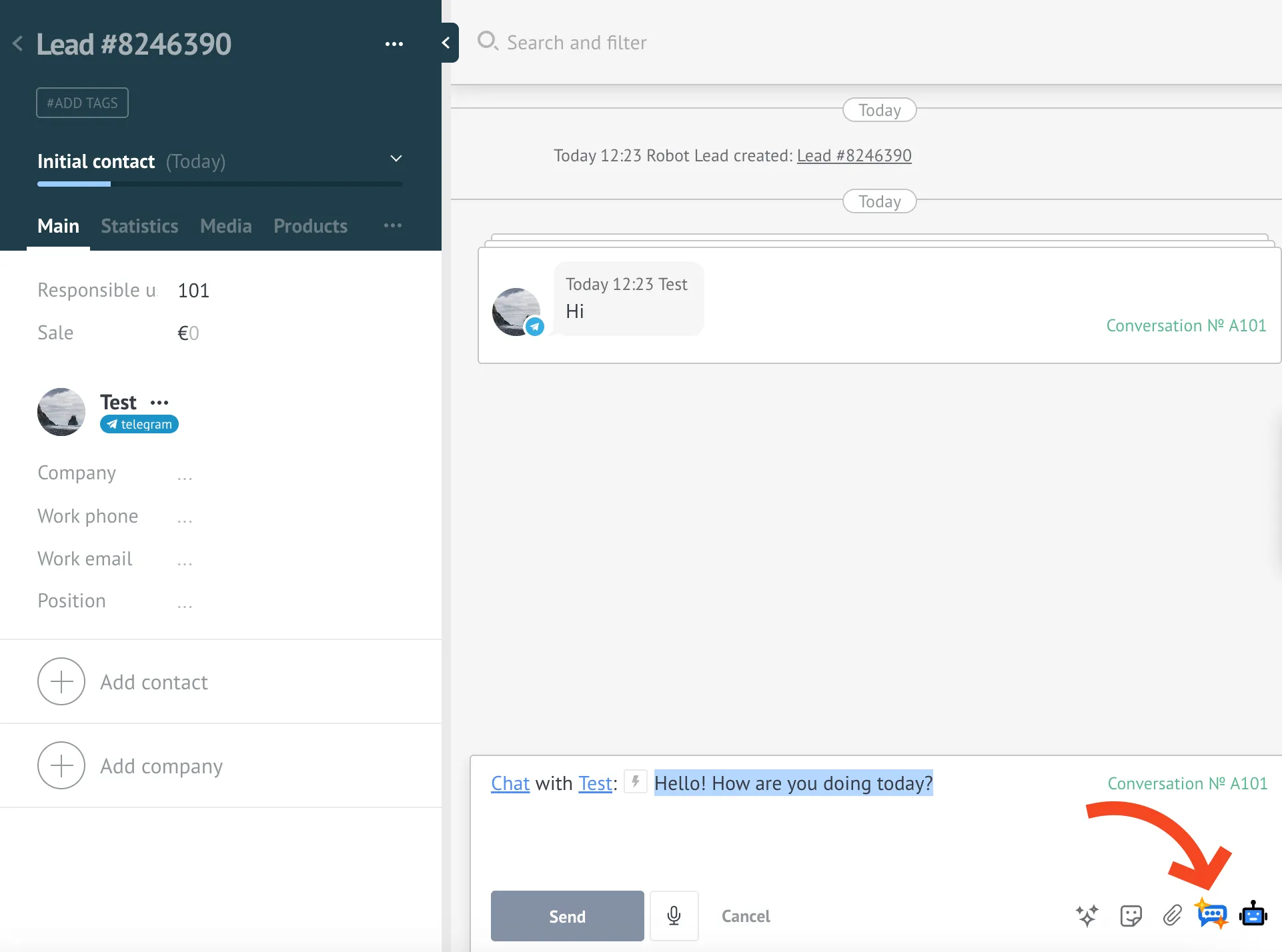 - With this enabled, the AI won’t auto-generate a reply. Click in the Kommo message area and press the “Generate message” button to get a draft.