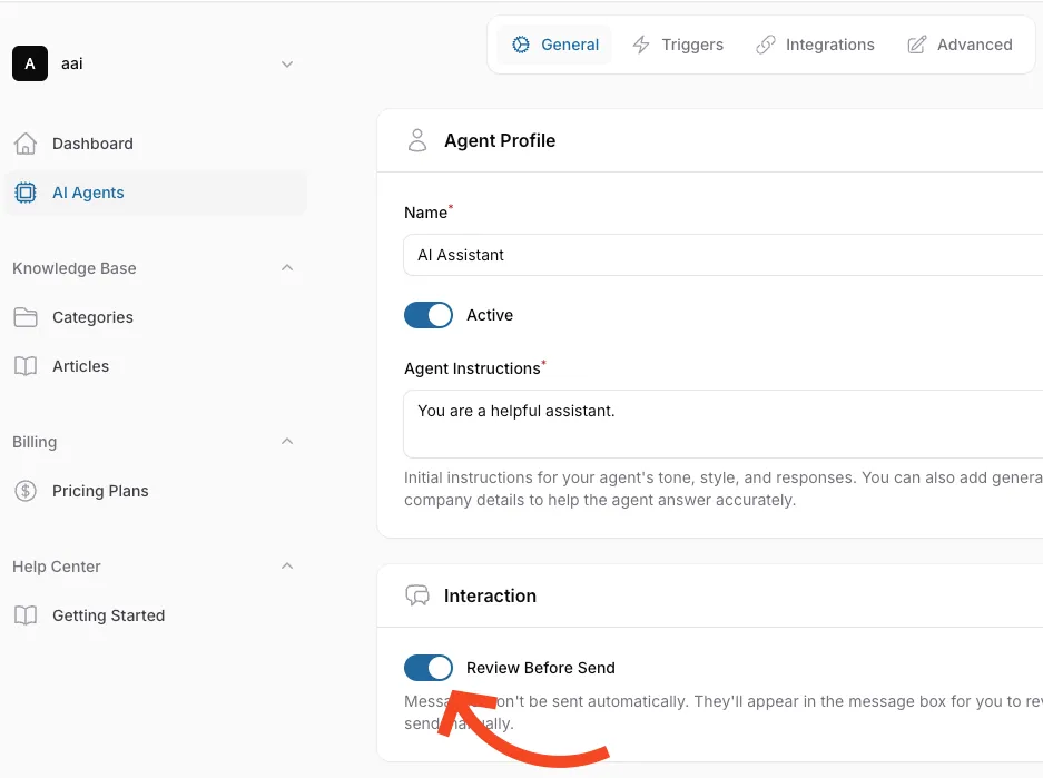 By default, automatic sending is enabled. Enable “Review Before Send” if you want to approve AI responses before they are sent to clients. Optionally, turn on “Generate reply manually” to create responses only on demand.