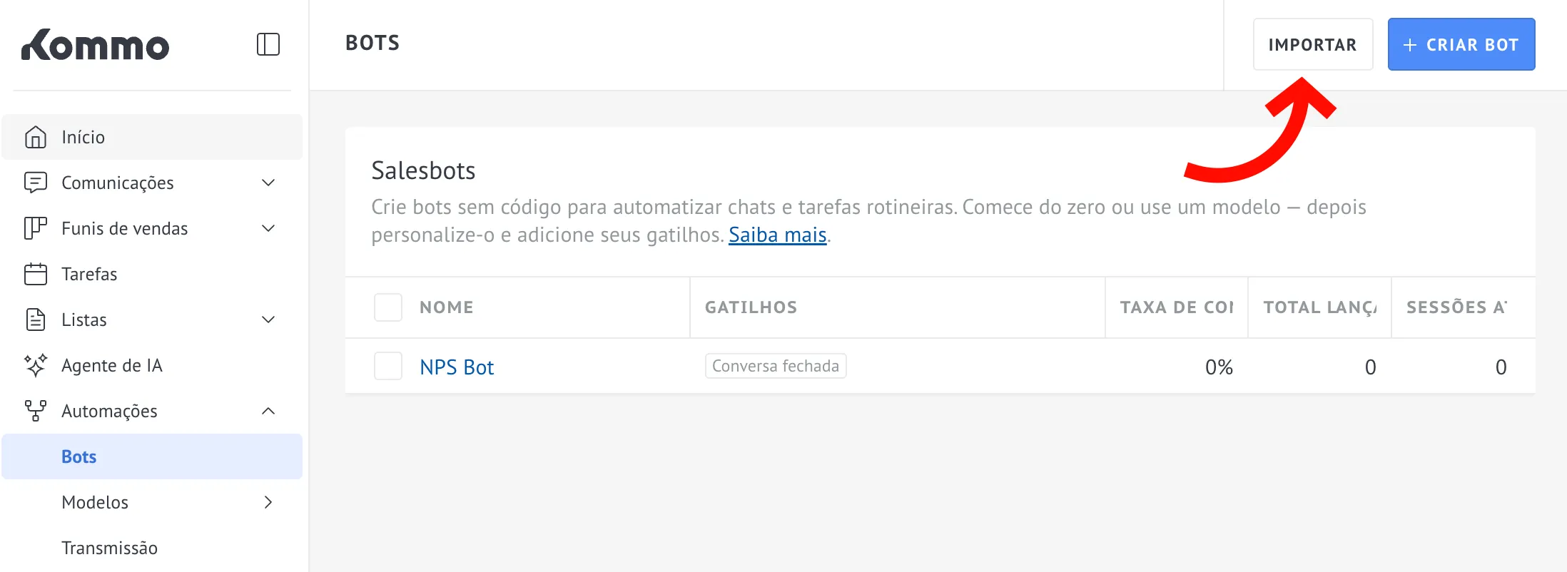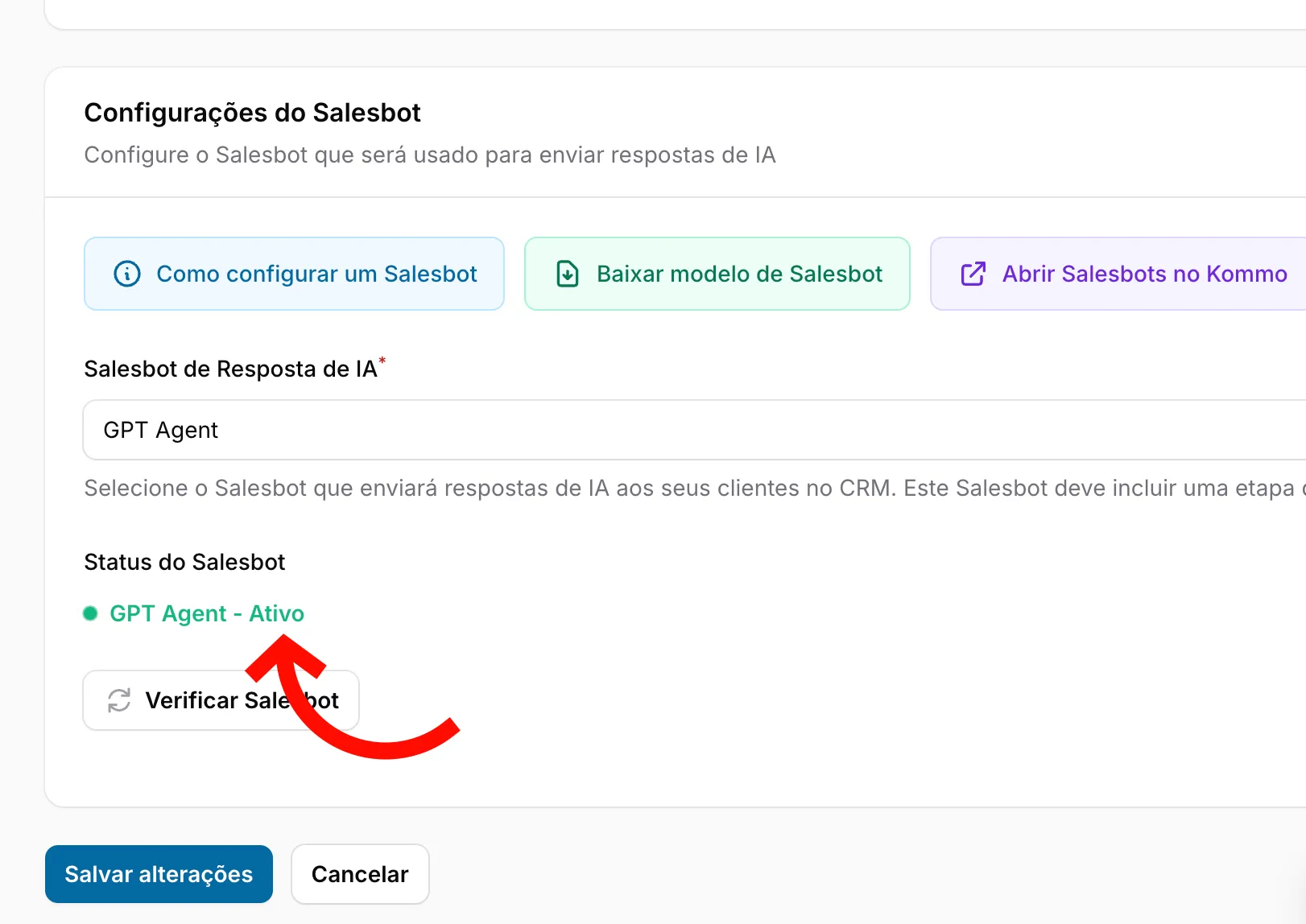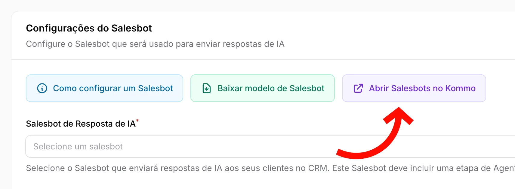 Para permitir que seu agente de IA envie mensagens no Kommo, você precisa conectar um Salesbot.