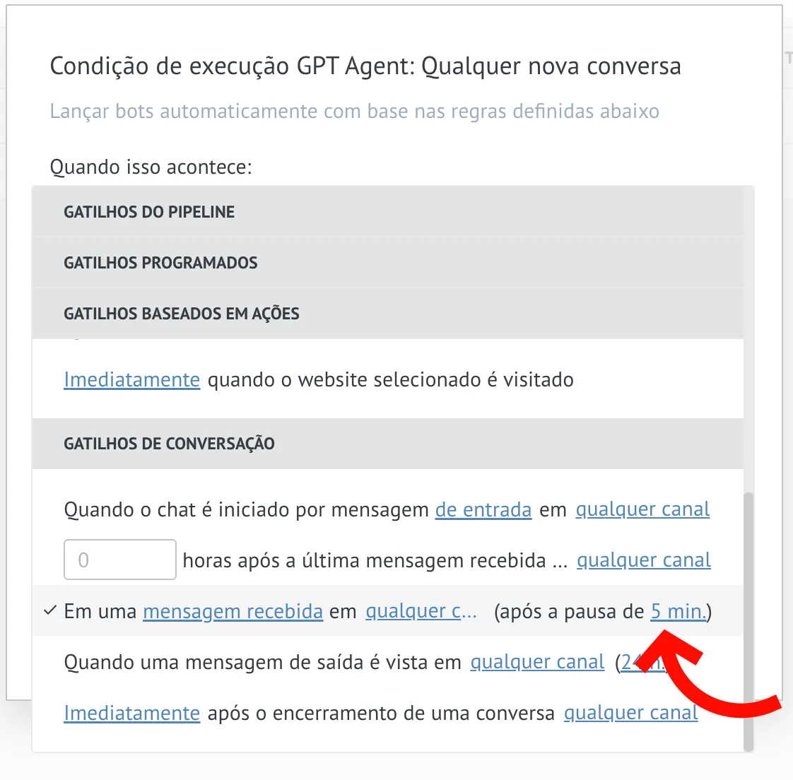 - Selecione Em uma mensagem recebida em qualquer canal (após a pausa de 5 min.)