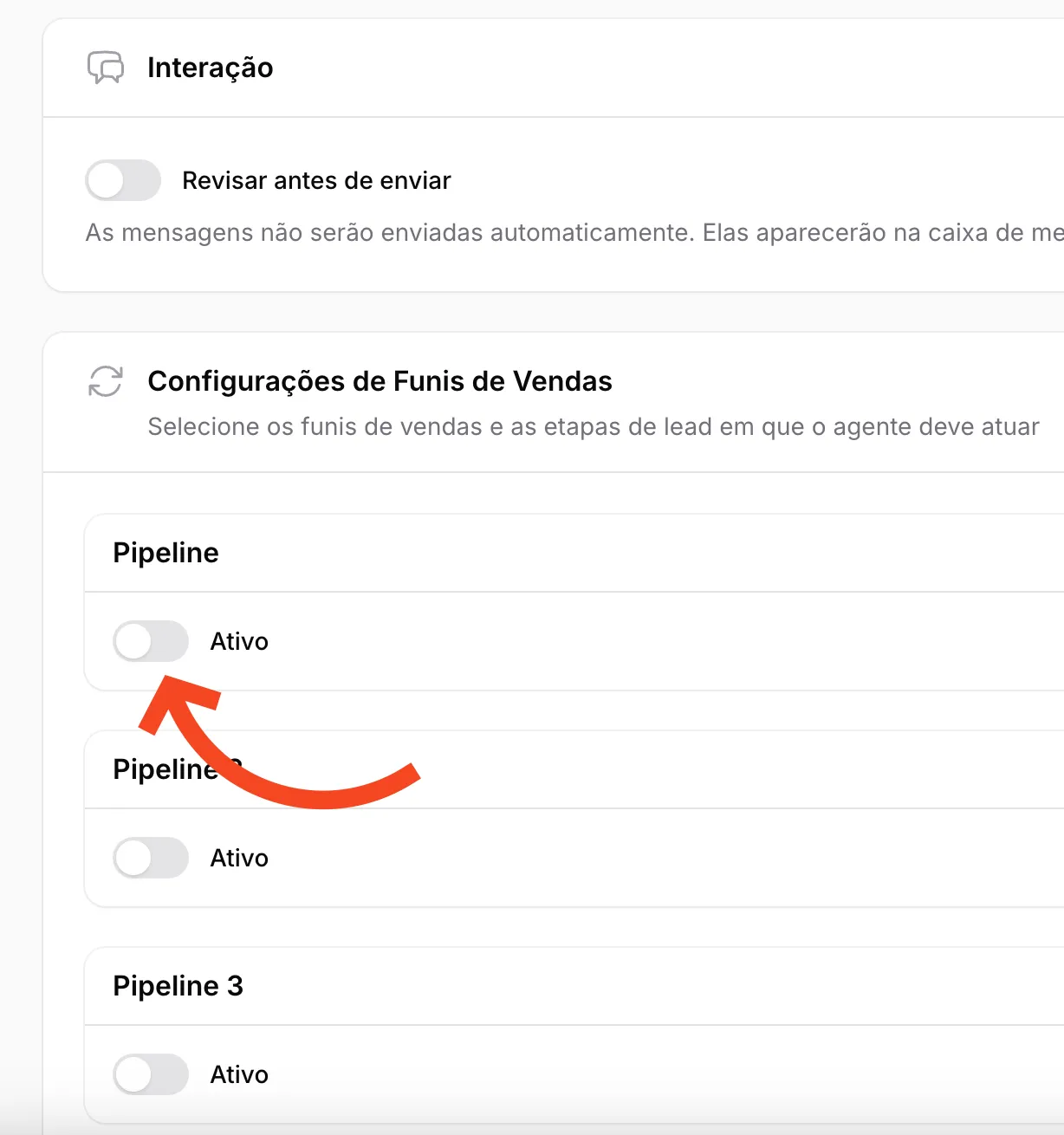 - Escolha quais funis de vendas e etapas de lead seu agente deve atender