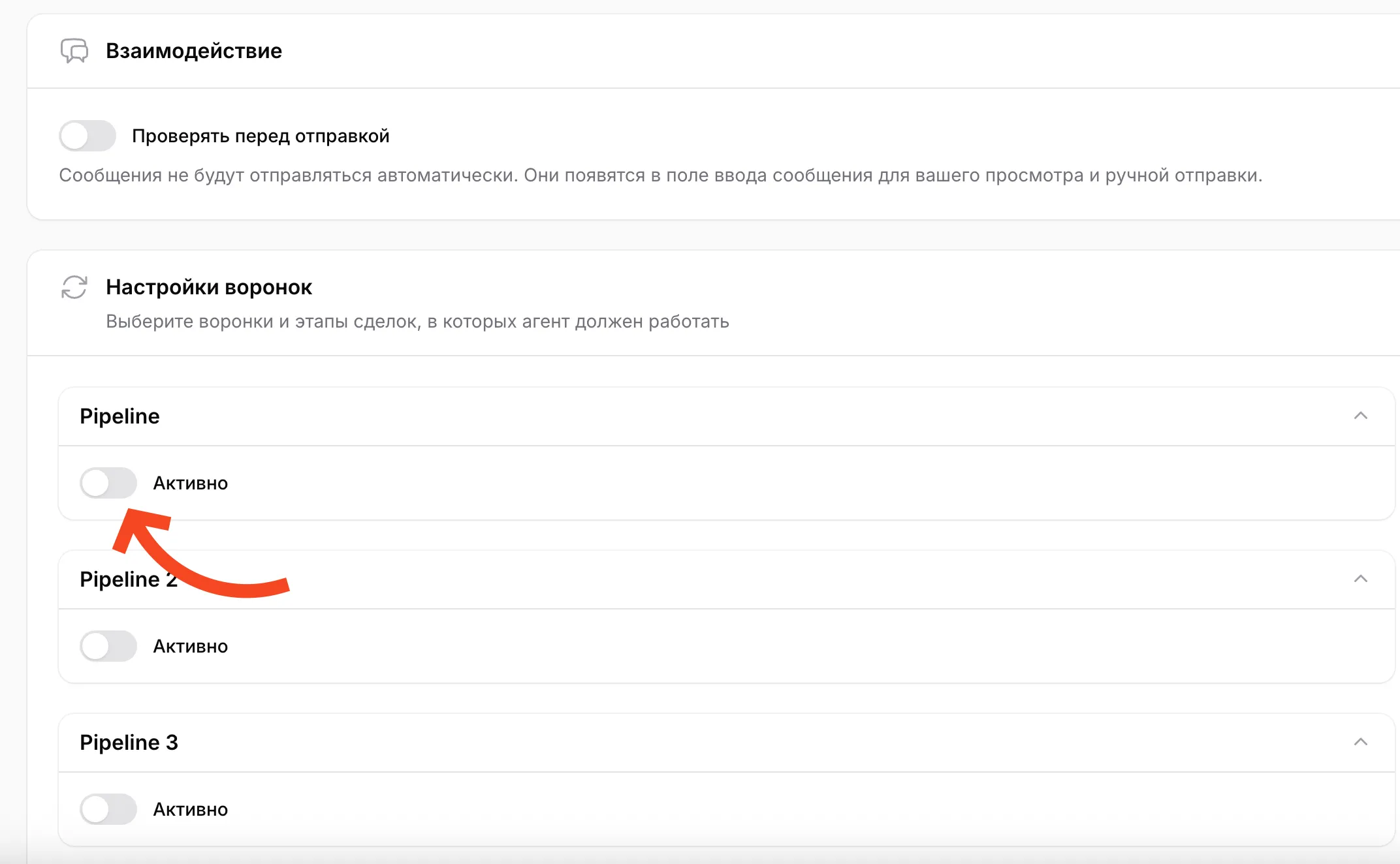 Чтобы начать использовать вашего Агента ИИ, укажите, в каких воронках он должен работать: