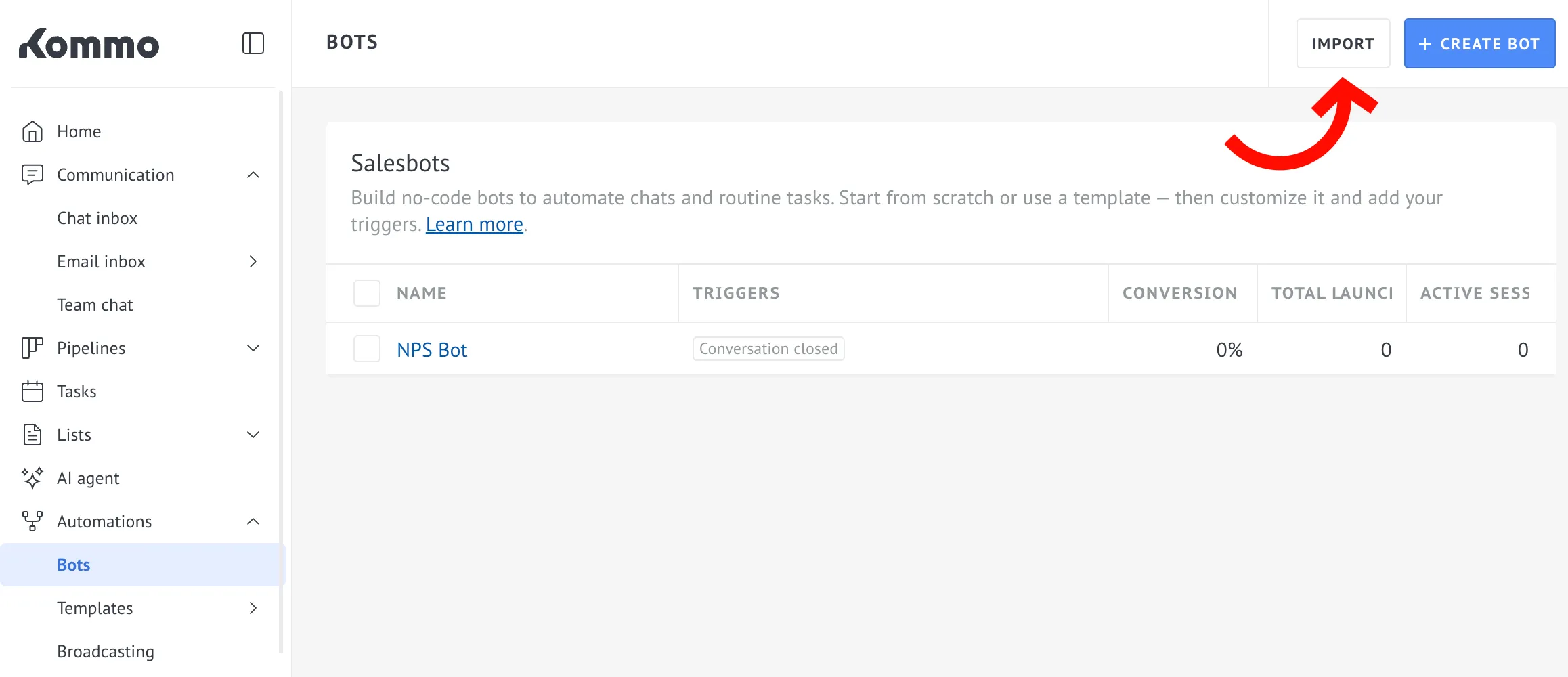 - Open your Salesbots list in Kommo (you can use the Open Salesbots in Kommo button).